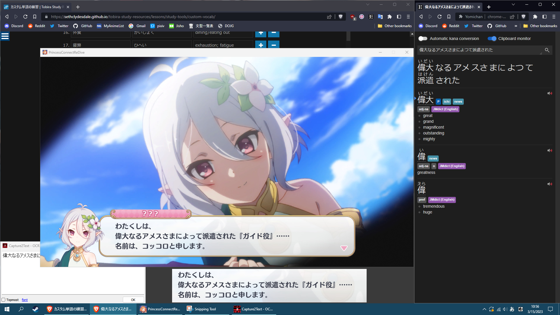 Yomichan is an incredible extension for studying Japanese. You can quickly look up words you don't know with it while reading or generate Anki flashcards with it. As I mentioned above, I often use this in tandem with Capture2Text while playing games, as the search page, which can automatically search your copied texts, is very handy for quickly looking up words or kanji (example).